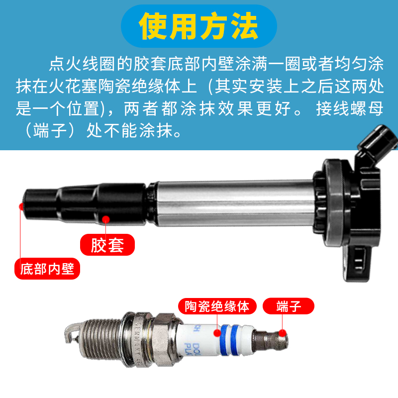 產品應用:適用于汽車點火線圈與火花塞陶瓷絕緣體、電接頭等處的絕緣、密封和潤滑。